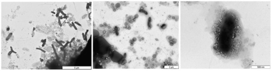After biodegradation of the AO7 dye, the bacterial cell morphology of biofilm that formed over the B-CSCM was evaluated by TEM analysis. At different magnifications, Figure 9 shows the presence of microorganisms on the biofilm sample. The microscopy images showed that most of the microorganisms could belong to the community of bacillus and vibrio bacteria. Some fungi may also be present as the inoculum was prepared from a mixed anaerobic microbial consortium obtained from a conventional wastewater treatment plant, where typically numerous groups of microorganisms exist.