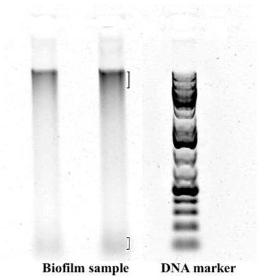Afterward, the DNA of the biofilm sample was collected to confirm the existence of microorganisms. DGGE fingerprint patterns (Figure 10) indicate that active microbial colonies existed in the biofilm sample. This analysis, however, was insufficient to give more detailed information on microbial diversity.