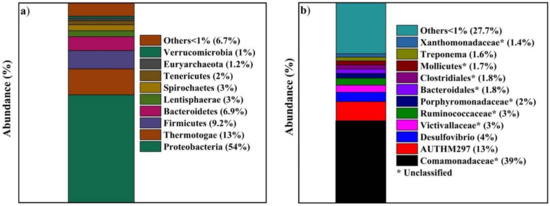 As illustrated in Figure 11a–b, bacterial analysis showed that the Comamonadaceae (39%) was the most prevalent bacterial community, followed by AUTHM297 (13%), Desulfovibrio (4%), Victivallaceae (3%), Ruminococcaceae (3%), Porphyromonadaceae (2%), Bacteroidales (1.8%), Clostridiales (1.8%), Mollicutes (1.7%), Treponema (1.6%), and Xanthomonadaceae (1.4%). The largest phylum consisted of Proteobacteria (54%), followed by Thermotogae (13%), Firmicutes (9.2%), and Bacteroidetes (6.9%). Fungi phyla distribution revealed that 90% of OTUs were not matched with any fungal taxonomic category. The rest of the OTUs was prevalent by Ascomycota (9.3%), composed by the genus Candida (0.5%) and the genus Pseudallescheria (8.5%).