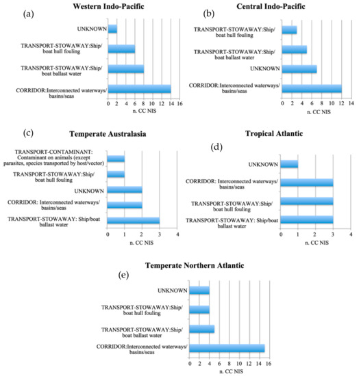 Number of CC NIS introduced in the Mediterranean Sea through primary introduction pathways, based on CBD [44] scheme associated with each of five major realms of Mediterranean CC NIS’s native distribution: (a) Western Indo-Pacific, (b) Central Indo-Pacific, (c) Temperate Australasia, (d) Tropical Atlantic, (e) Temperate Northern Atlantic. Several species are linked to more than one pathway.