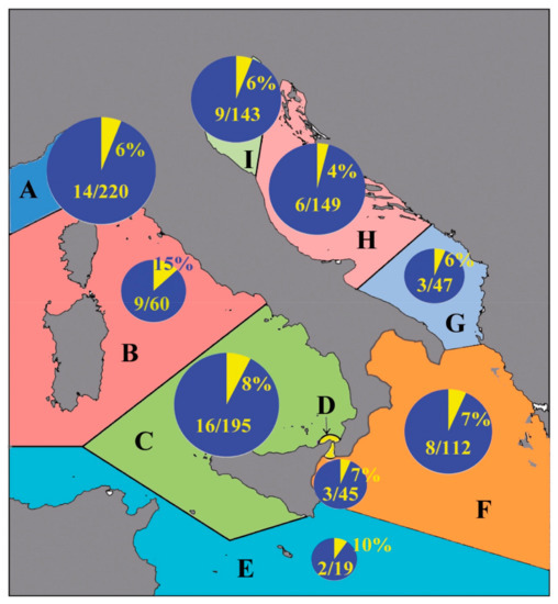 Distribution of CC NIS in each biogeographic area within the Italian Seas following Bianchi [93]. (A) Ligurian Sea; (B) central Tyrrhenian Sea; (C) south Tyrrhenian Sea; (D) Strait of Messina; (E) south-eastern tip of Sicily, Pelagie Islands; (F) Ionian Sea; (G) south Adriatic Sea; (H) central Adriatic Sea; (I) north Adriatic Sea. For each sector, CC NIS percentage and CC NIS number/Cnidaria and Ctenophora total number are shown.