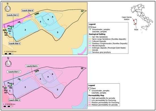 The study area is located in Sardinia, in the province of Cagliari, on the border between two different municipalities (Figure 1). The landfill plant is part of a complex geological setting, characterized by the presence of the Nurallao deposits, consisting mainly of sandstones (Serra Longa sandstones) (Geological Map of Sardinia (1:25,000.00)). However, on the north-west side of the plant, it is also possible to check for the presence of alluvial deposits, dates to the Holocene epoch, and the anthropic deposits. The anthropic deposits are from both the landfill and the quarries near the study area.