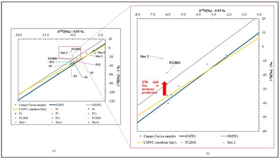 δ2H vs. δ18O values for Case History I: all samples (a) and Slot 2 & P12bis (b).