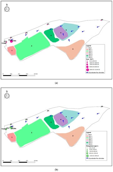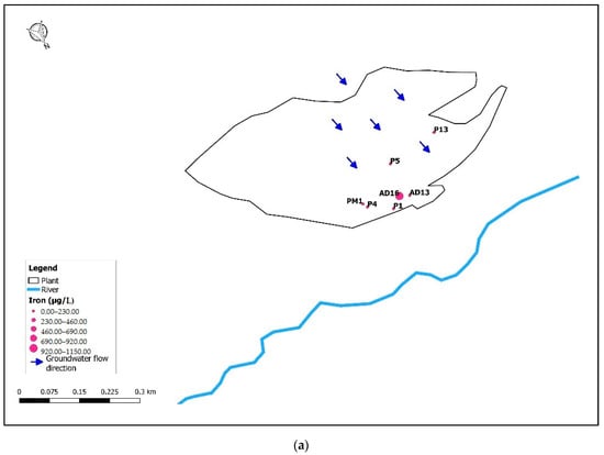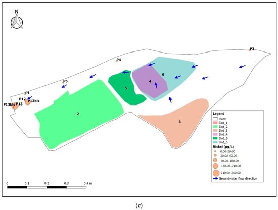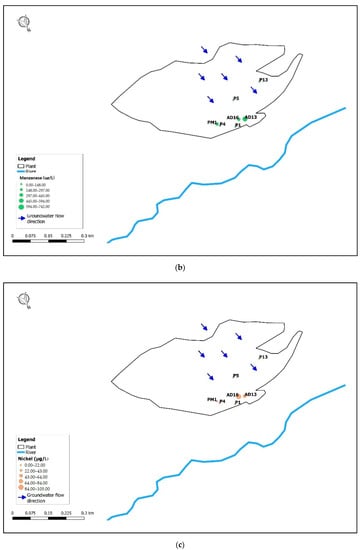 Figure 5 shows high values from upstream to downstream of the plant, especially for the P12bis piezometer. In particular, there are concentrations equal to 8022 μg/L for Iron (Figure 5a), 2941 μg/L for Manganese (Figure 5b) and 221 μg/L for Nickel (Figure 5c), significantly higher than the threshold by Legislative Decree 152/06. Figure 5 shows very high concentrations, sometimes higher than the Legislative Decree 152/06 threshold for the Iron (200 μg/L), Manganese (50 μg/L) and Nickel (20 μg/L), also in P12, P13 and P13b is groundwater samples. This behavior is not detected by the isotope diagram in Figure 5, which is however a good indicator to verify possible interactions between groundwater and leachate.