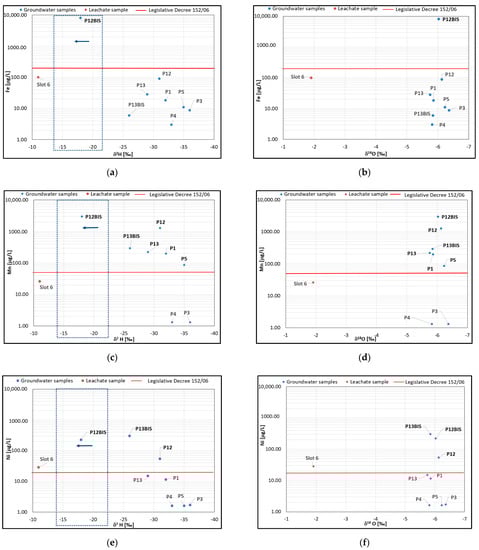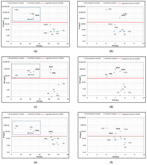 Figure 9, again, confirms what showed in the isotope diagram of Figure 7, as it shows not only values over the legal threshold for Iron (Figure 9a), Manganese (Figure 9c) and Nickel (Figure 9e) in AD16 groundwater sample, but also a δ2H enrichment. In fact, the AD16 groundwater sample shows trends closer to the sample by PE1, a tank used for the leachate storage. In fact, the leachate samples coming from points PE1 and PE2 show different behavior with respect to the groundwater samples. Moreover, the other groundwater samples, although they have concentrations over Legislative Decree 152/06 thresholds for the three analytes, do not show the same deuterium enrichment. In regards to the relationships between δ18O and Iron (Figure 9b), Manganese (Figure 9d) and Nickel (Figure 9e), no enrichments are highlighted. Therefore, this processing confirms that the methanogenesis phenomena cause a deuterium enrichment, due to bacteria use the “lighter” isotope hydrogen (1H), without generating variations for 18 oxygen isotope.