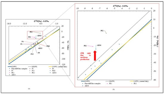 δ2H vs. δ18O values for Case History II: all samples (a) and PE1, PE2 & AD16 (b).
