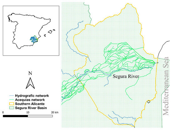 The Vega Baja region is located on the lower course and floodplain of the Segura River in southeastern Spain—it encloses one of the six traditional “huerta” artificial landscapes in Europe [42]. The Vega Baja huerta is the largest and most complex of the three huertas in Spain, with the widest irrigation and drainage network [43]. The irrigation infrastructure of this centuries old huerta ecosystem is formed by an extensive network of irrigation channels and drainage ditches characterized by scarce slopes and a reutilization system of drainage water, “dead waters”, which allow for irrigation of land at lower altitudes towards the river mouth, with drainage waters from upper areas.