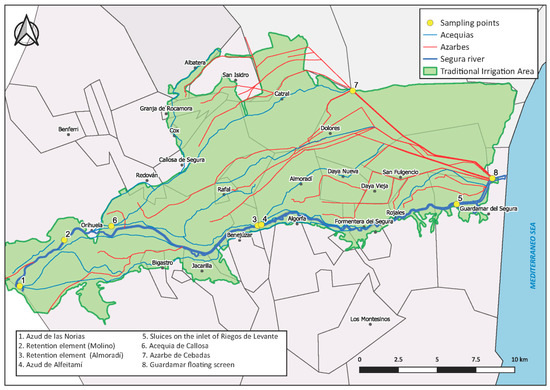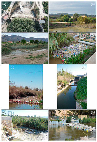 Sampling points. ID1, Azud de las Norias (a); ID2, boom at the Molino de la Ciudad (b); ID3, boom at Almoradí (c); ID4, Azud de Alfeitamí (d); ID5, inlet of Riegos de Levante (e); ID6, Acequia de Callosa (f); ID7, Azarbe de Cebadas (g); and ID8, Guardamar floating screen (h).