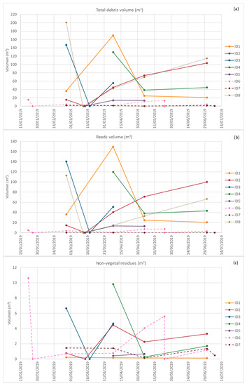Volume of reeds and non-vegetal waste are displayed in Figure 5. The total debris volume shown in Figure 5a presents different trends along time depending on the sampling points. In general, the prevalence of reeds debris (Figure 5b) heavily influenced the trend of the total debris volume. On the riverbank (ID1, ID2, ID3, ID4, and ID5), reeds represent the most abundant type of debris. Area occupied by reeds was higher than 85%. Volume could be even higher since the plastic waste was often on a layer of reeds. Estimated weight of plant debris on these sampling points was over 98% of total debris weight.