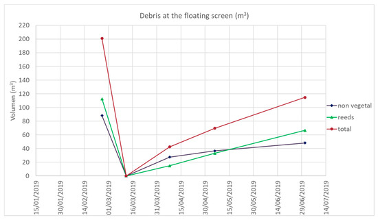 The results show that the volume of reeds is the main component of floating debris on the riverbed. Estimated weight of plant debris on these sampling points was over 98% of total debris weight. These numbers are similar to the results reported [30] for the Seine River, where plant debris represented between 92.0% and 99.1% of total debris by weight.
