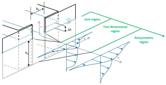 Many studies address rectangular surface jets that are created by flow through nozzles or channels with an aspect ratio b/h at the water surface. Well-investigated analytical methods exist to describe such jet propagation, in which the three-dimensional rectangular surface jet created by nozzles can be divided into three sequential regions along the centerline (Figure 1, [,,,]): (i) nearest the orifice, a core zone characterized by a constant velocity that is equal to the inflow velocity at the nozzle occurs; (ii) a two-dimensional region is next, where centerline velocity decay is that of a plane jet; (iii) the most downstream is an axisymmetric region where the centerline velocity decay is that of a round jet. Regions (ii) and (iii) are characterized by self-similarity of velocity profiles at different cross-sections. With nozzles, jet propagation mainly depends on nozzle geometry [,,,] and aspect ratio, e.g., [,,,,,]. For example, [,] show that jet propagation in the near field close to the orifice exit is influenced by the geometric shape of the orifices (i) and the beginning of (ii). These studies show a similar jet propagation further downstream for all orifice shapes. Typical parameters used to analyze jet behavior are the half-length and the half-width . The half-length is the distance from the orifice exit to the position where half the velocity is reached. It may be used to determine the propagation length and thus be suitable to estimate an attraction flow into the tailrace for fishways [].