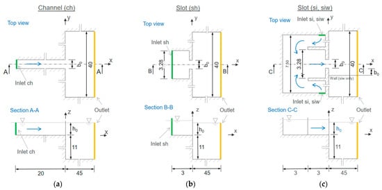 - Slot geometry with a homogeneous approach flow (sh, Figure 2b) for investigating the effect of a slot;