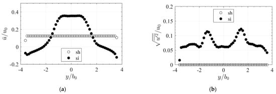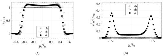 Lateral distributions of (a) mean normalized streamwise velocity and (b) turbulence intensity in the inlet section of the homogeneous slot configuration (inlet sh ) at where for configurations sh-des, si-des. Distances are normalized with channel/slot width .