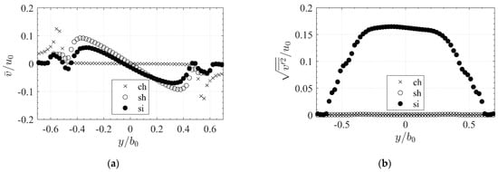 The normalized time-averaged lateral velocities in the orifice exit of ch-des are mostly homogenous whereas of sh-des and si-des show the constriction effect of the slot towards the centerline (Figure 4a). The peaks of the sh-des jet ( are higher than those of the si-des jet (), but the fluctuations of si-des are more distinct and even larger than the mean velocities (up to , Figure 4b). For all configurations, fluid is entrained from outside of the jet (Figure 4a).