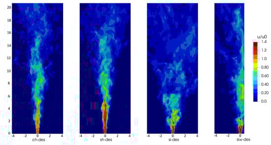 sh-des and si-des have different velocity distributions and turbulence intensities in the cross section of (Figure 5). For the sh jet, a constant velocity distribution and zero turbulence intensity are applied at inlet sh (). The si jet shows a normalized velocity peak at m of and a back flow of about close to the walls. The normalized turbulence intensity at these positions is up to 0.12. The inlet conditions of the siw case are equal to the si case.