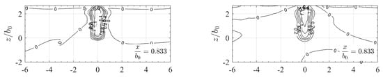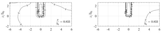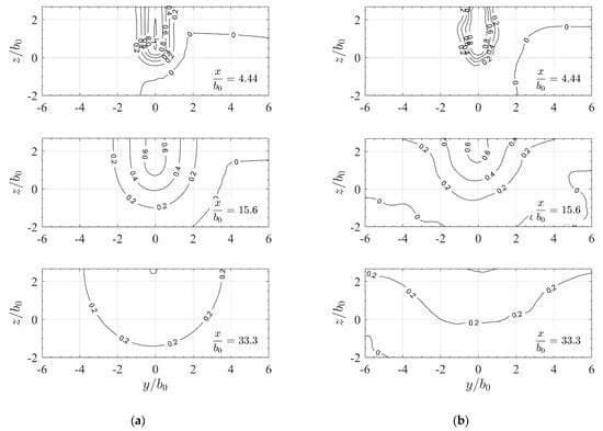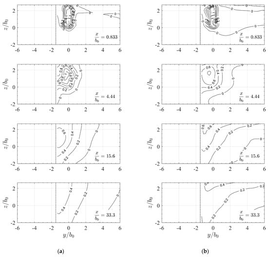 Slot jet with homogeneous approach flow showing isolines of the normalized streamwise velocity component in yz-sections with relative distances from the orifice as simulated for (a) sh-rans and (b) sh-des slot configuration. Distances and are normalized with channel/slot width .