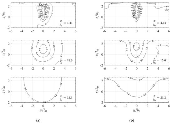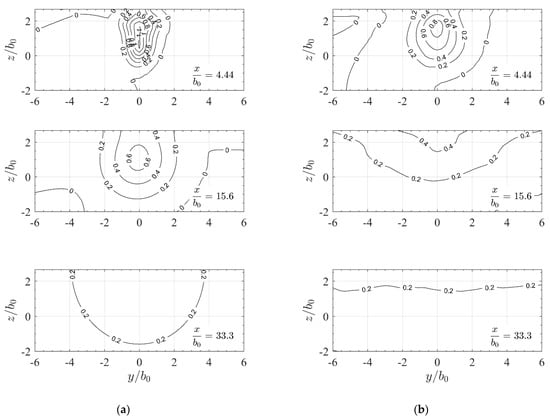 Channel jet showing isolines of the normalized streamwise velocity component in yz-sections with relative distances from the orifice as simulated for (a) ch-rans and (b) ch-des channel configuration. Distances and are normalized with channel/slot width .