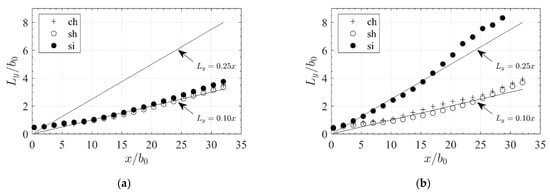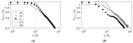 We compared downstream evolution of streamwise mean velocities at the water surface to analytical approaches [,] (Figure 13). The evaluation along the water surface centerline is used since the maximum velocity is located at the water surface and along the centerline for surface jets from nozzle orifices and in theoretical models. All velocities are normalized by the bulk-mean exit velocity . The ch jet shows good agreement for the entire range of velocities at the water surface when compared to theoretical decay for both simulation methods (Figure 13a,b). Transition locations between the characteristic zones (from core zone to two-dimensional region at and from the two-dimensional region to the axisymmetric region at ) are predicted correctly. In contrast, both slot jets show higher velocities close to the exit caused by the vena contracta effect at the slots. Downstream of the exit, substantially decreases until because of the water level drop at the slot and the corresponding jet submersion. The flow reattaches the surface at approximately . Thereafter, the jet develops similar to axisymmetric jets. In the near field, the decay is strongly influenced by these effects for both types of approach flow for the slot jets (sh and si). However, both effects are not appreciable in the far field for sh jet where its velocity decay follows the same trend as the ch jet, which is in accordance with []. In the far field, there is no difference in surface velocities among ch, sh, and si-rans configurations. However, streamwise surface velocities in the far field of si-des are reduced by 30%. The reduction is consistent with the higher lateral growth rates of the jet observed in Section 3.3.3. It should be noted that the velocities downstream are subject to inaccuracies because of grid resolution effects.