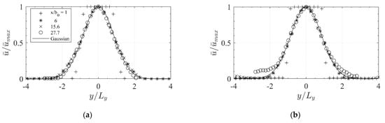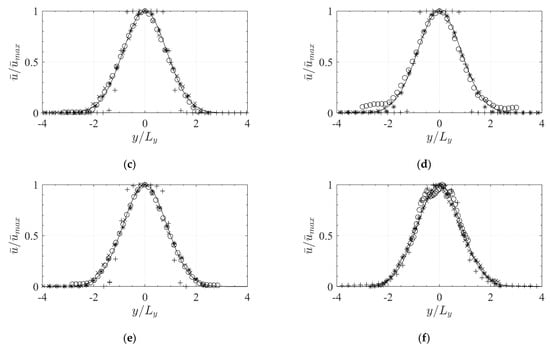 The lateral distributions of in the height normalized by the local velocity maximum on the centerline at the respective was used to assess self-similarity in the propagation of the jet [] (Figure 12). Locations are normalized by . The symbols represent the distributions at four distances from the orifice. For comparison, the normalized standard Gaussian function is plotted. The potential core zone with the non-Gaussian distribution is present for all simulations at . Outside the potential core zone, the profiles for all cases approach the Gaussian distribution, indicating the self-similar development of the jets. The transient DES simulations slightly deviate from the Gaussian distribution in the far field, suggesting that the temporal averaging time of 360 s is still not sufficient to exactly represent the si jet in the far-field. However, in general, self-similarity is reached for all jets independently of the simulated configuration.
