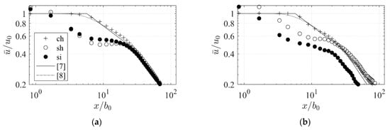 The half-length defined as the longitudinal distance from the orifice exit, where , is evaluated as a further measure to compare jet propagation. For homogeneous approach flows, ch and sh, correspond well to the half-length derived from analytical expressions [,] independent of the simulation methods. Half-length for the slot with an inhomogeneous approach flow si is about 2.3 times shorter () as computed with DES while results computed from si-rans are substantially longer ().