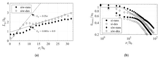 The development of wall jets was compared to that of free jets by examining the evolution of jet half-width with the downstream location (Figure 16a). The results of siw-rans suggest a relatively constant growth rate for half-width, which is lower than that of a free jet simulated with RANS (si-rans) where growth rates of 0.1 are determined. In contrast, the siw-des results show a more distinct behavior where development of the half-width can be divided into two regions in which the first is associated with the free flow region and the second with the influence of the lateral wall. In the first region close to the orifice exit, the growth rate of the half-width is approximately 0.25, which is identical to that of the free slot jet (si-des). Beginning at the growth rate substantially decreases until the half-width transitions to a local minimum at because of the attachment of the jet to the wall. Further downstream, the half-width increases at a constant growth rate of 0.65, which is identical to the experimental results of plane jets with the same wall distance to slot width ratio reported in [].