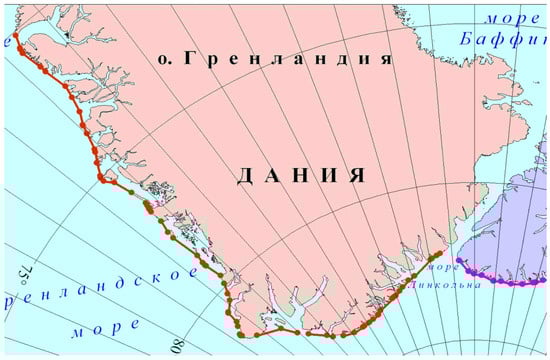 The segments legislatively marked along the coast of Greenland total 75 in the south and 82 in the north, practically fully covering the island; straight baselines are drawn along them. The longest straight baselines are up to 65.6, 67.2 and 66.4 nautical miles long (the English names for the relevant places are Disco Bay, Umanak Fjord, Kane Basin) on the western coast; and 67.2 and 80.1 nautical miles in the north, in the vicinity of the Princess Dagmar Peninsula.