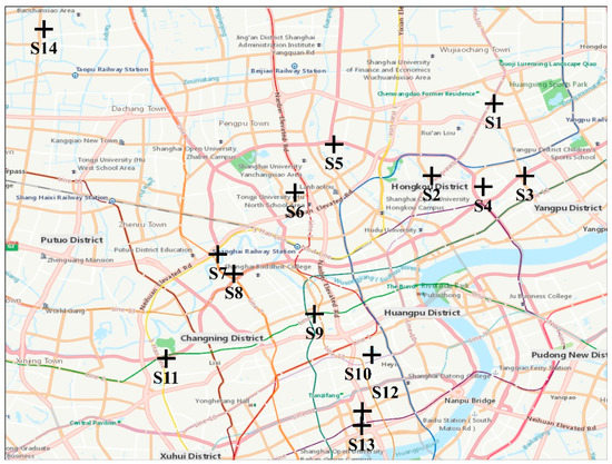 Spatial distribution of the 14 investigated communities in Shanghai.