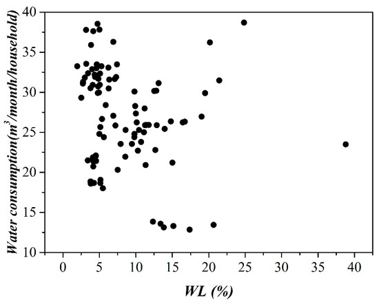 The relationship between the number of community residents and water consumption was examined by using the annual average water consumption and WL of each community from 2011 to 2017. Figure 2 shows that there is no significant relationship between the WL and water consumption, that is, the number of community residents does not affect water consumption. When the community has a large population, water consumption does not increase; when the number of residents decreases, water consumption does not decrease significantly.