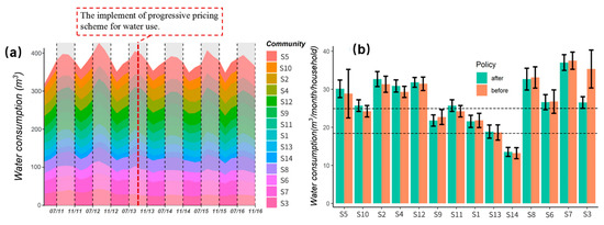 The data from Shanghai Chengtou Water Group Co., Ltd. show that the annual water use is below 220 m3 in 90.4% of the households, corresponding to 18.33 m3 per month. Accordingly, the water use in all the communities investigated was over the first progressive water price level, except for that in S14 (13.39 (±1.30) m3 per month). Figure 3a shows the variety of the water use of each household in the 14 communities across 36 months. The water use in most communities exhibited significant seasonal features for the significant difference between July and March (p = 0.0118). Communities in which there was a large fluctuation in water use are at the top of the graph. The water use of S3 and S5 shows the most significant and weakest seasonal features, respectively. The peak value of water use is found usually between August and September due to the high demand for showers, washing and irrigation in the summer. Conversely, the lowest values of water use are seen in January and February. The thicknesses of the areas indicate the values of water use. According to [32], outdoor air temperature is the most significant factor for water consumption. As shown in Figure 3a, the water use of the communities in the bottom part of the figure is usually large with weak seasonal features. There were no significant differences between water use in summer and winter in communities such as S3 (p = 0.2585) and S7 (p = 0.154), which might lead to a large degree of water use in those communities. Figure 3b shows the household water use before and after implementation of the PPS; the three levels of the PPS implemented in Shanghai are marked with dotted lines in the figure. It can be concluded that there were no significant decreases in household water use in all the communities apart from S3. The household water consumption before and after the implementation of the PPS in S3 was 35.68 (±4.97) m3 per month and 26.71 (±1.70) m3 per month, respectively. It may be because the S3 community used a lot of water before the implementation of the PPS; in addition, the houses here are older, and there are more permanent elderly residents. As can be seen, the implementation of the PPS has a great impact on S3’s water consumption. The time-series changes in the monthly average water consumption are relatively stable (Figure S3). The average water consumption of 6661 households before and after the implementation of the PPS is compared in Figure S4; it can be observed that the impact of the implementation of the PPS on residential water consumption is not significant. In other words, the use of the PPS for saving water did not reach the expected aims.