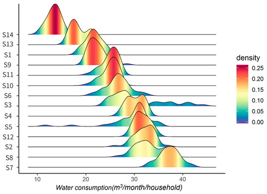 Figure 4 shows the water use of the 14 communities from 2011 to 2017. S14 had the lowest mean water use, at 13.39 (±1.30) m3, whereas S7 had the highest mean water use, at 37.25 (±2.14) m3. It is worth noting that there were large fluctuations in water consumption in communities with high water consumption, but this cannot be explained well by the seasonal effect. For instance, combined with the results of Figure 3a, the water use in S10 showed a significant seasonal variety with a concentrated density distribution, whereas that in S3 showed a weak seasonal feature with a scattered distribution. Conversely, the water use densities of the communities below S10 were concentrated and conformed relatively to the normal distribution. Water consumption was recorded on a per household basis, and the number of households had a certain impact on water consumption. Therefore, a concentrated distribution of water use might suggest a large number of permanent residents in this community and a low frequency of population mobility. In addition, the level of water consumption was relatively low in the upscale communities of S9 and S10 and the old communities of S13 and S14. As mentioned, the PPS was implemented in consideration of the economic status of the residents and their ability to pay, and they are charged in a stepped way according to the actual water consumption of the residents. However, the aim of the PPS to achieve a reasonable distribution of water resources and save water by balancing the consumption between poor and rich households has not been achieved.