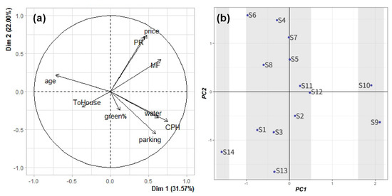 (a) The plot of 9 variable loadings with varimax rotation. (b) The plot of principal component scores of the 14 communities on PCs: price, housing price; age, age of the building (until 2017); PR, plot ratio; MF, management fees; ToHouse, total number of households; parking, number of parking sites; CPH, number of parking sites per household; green%, green area ratio; water, the average water consumption per household in the community.