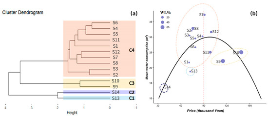 The high-end, mid-range, and low-end communities are divided according to the price and geographical location of the dwellings. At the same time, because of the higher prices, the WL of the communities is also higher (Table 1). Price and WL reflect the quality of the house. The price and WL (housing quality) in 2017 were chosen to represent the location factors. Combined with the household water use in 2017, HCA was conducted to divide the 14 communities, as shown in Figure 6a. The clusters of C1 and C2 are close due to the common low water consumption of these two communities. S9 and S10 are in the C3 cluster due to their high prices and low water use. The remaining 10 communities, which had mid-range house prices with high water use, are in the C4 cluster.