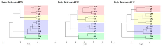 The dendrogram of the 14 communities through hierarchical cluster analysis (2011, 2013, 2015).