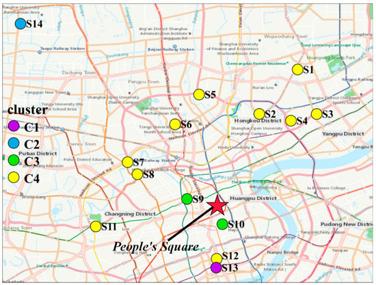 There was a significant linear relationship between price and WL (p = 0.000365). A low WL value can be explained from two points of view: (1) The percentage of rented households was large in medium-grade communities due to relatively low rental charges. (2) Due to the large number of permanent residents and the poor living conditions of old communities, there were not many houses available to be rented. In addition, rented houses in Shanghai, with water rates included, were usually paid for by several young office workers. As mentioned in the literature review, the households rented by two or more young people with independent income showed the highest water demand, conforming to that of rented households in Shanghai. Thus, in the upscale communities (S9 and S10) and old communities (S13 and S14), which had low frequencies of population mobility, most residents were permanent, leading to low and steady levels of water consumption. Older people were the main residents in old communities and there were fewer rental houses in these communities, leading to a low WL. Medium-grade communities, which were near the peak of the parabola, had a large percentage of rented households, leading to high water use. To further confirm this view, we combined the results of HCA with locations of communities, as shown in Figure 8. Taking People’s Square as the commercial center. The communities, which were far away from the commercial center (S14) and close to the commercial center (S9 and S10), had commonly low water consumption. The communities in C3, which had low WL values and high water consumption, were located around the business center of Shanghai. Thus, the findings showed that rental households were the main consumers of water.