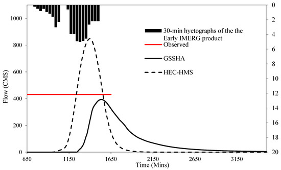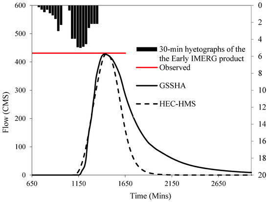 When using the IMERG Early run product as input, HEC-HMS overestimated the peak by 4.5%, while GSSHA overestimated the peak by just under 1% (Table 2 and Figure 13). However, the estimated runoff volume and the percentage of infiltration losses estimated by the two models were quite different. Again, the runoff volume estimated by HEC-HMS is much lower than the GSSHA estimate. This may indicate that HEC-HMS was not able to represent the complex topography of the study area.