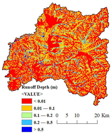 In this study, the Curve Number (CN) loss model [43] was used to compute surface runoff. According to this method, the excess rainfall is computed according to