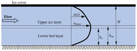 The presence of the ice cover causes the increase of the wetted perimeter, which increases the composite flow resistance. Owing to the different roughness of ice cover and channel bed, the velocity profile is vertically asymmetric (see Figure 1). In Figure 1, the vertical flow structure can be divided into two independent layers at the plane of maximum velocity, i.e., the upper ice layer and lower bed layer. The flow in the upper ice layer is mainly affected by the ice cover, and the lower flow is primarily affected by the channel bed. The vertical location of the maximum velocity is determined by the roughness of the ice cover and channel bed, i.e., the maximum velocity will not occur at the free water surface but near the middle of the water depth.
