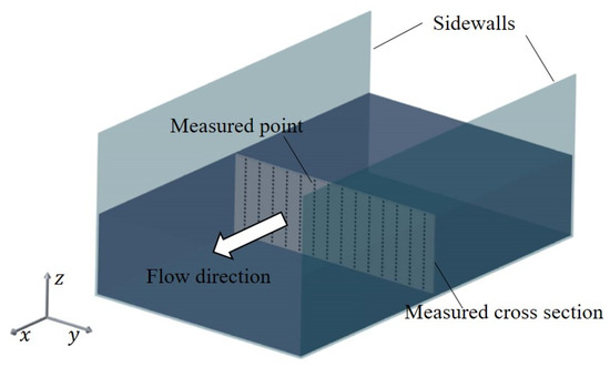 The rectangular coordinates are as follows: x is the main flow direction with x = 0 at the beginning of the ice cover; y is the lateral direction with y = 0 at the sidewall and z is the vertical direction counting from the channel bed. The velocity was measured at the cross section with x = 9 m, which is sufficiently far from the ice cover entry to form a fully developed flow. In the measured cross section, 14 measured lines are arranged, where the measured points are also arranged with a uniform vertical distance 1 cm. The detail layout is shown in Figure 3.