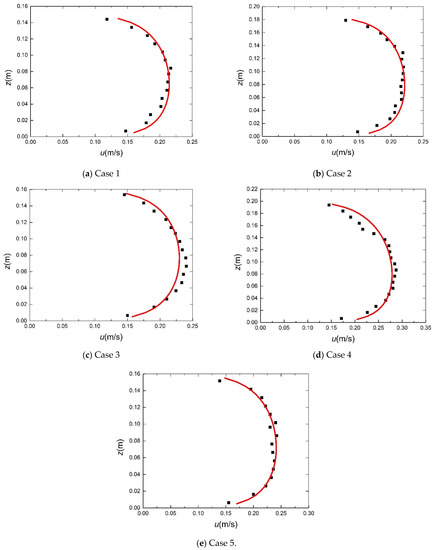 As shown in Table 2, the time-averaged longitudinal velocities obtained from the proposed model were reliable within an accuracy of 0.019 m/s in terms of the average absolute error . The average relative error was 2.86–10.97%. The average absolute error and average relative error of the Reynolds stress were within 0.093 m/s and 13.63%, respectively. The average absolute error and relative error of the turbulence intensity were within 0.0019 m/s and 12.54%, respectively. All values in Table 2 were below 20%, which further confirmed that the proposed analytical model was reliable and feasible to predict the velocity and turbulence structure in the ice-covered flow.