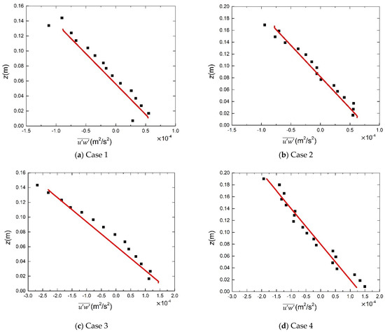 Since the viscosity shear stress in the flow is much smaller than the Reynolds stress, the viscosity shear stress can be neglected in Equation (4) [29,30]. Then, there is a linear relationship between the shear stress and the vertical axis . Equation (4) has another form and is shown as