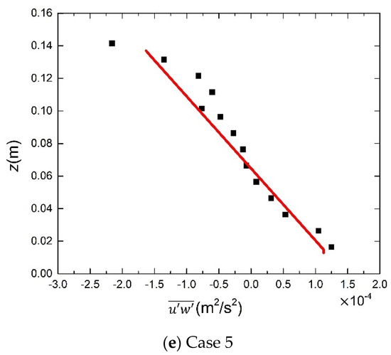 Figure 5 presents the profiles of measured Reynolds stress and analytical Reynolds stress for all experimental cases. The Reynolds stress in the longitudinal direction demonstrates a linear distribution along the water depth. Zero shear stress occurred at the location of near the middle of the water depth, after which the absolute value of Reynolds stress gradually increased and reached each peak near the fixed boundaries. The measured and predicted data in Figure 5 were basically consistent and had identical trends, which indicates that our proposed model for Reynolds stresses was feasible.
