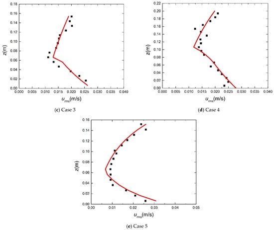 Considering the locations of the maximum velocity and zero shear stress for cases 1, 3 and 5, when the ratio of to increased, decreased, so the location of the maximum velocity approached the channel bed, and the vertical inhomogeneity of the velocity profile was strengthened. Meanwhile, increased with the increase in then, decreased, which indicates the location of the zero shear stress gets closer to the channel bed.