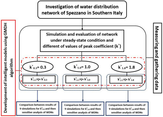 Despite many studies having been conducted in evaluating water distribution networks, more studies are required nowadays according to the importance of the issue and the existence of unknown dynamic factors in WDNs [23,24,25,26,27]. For this purpose, a numerical analysis with the EPANET software and GMDH algorithm as one of the appropriate artificial neural networks has been employed in this study. The flowchart of the study is presented in Figure 1.