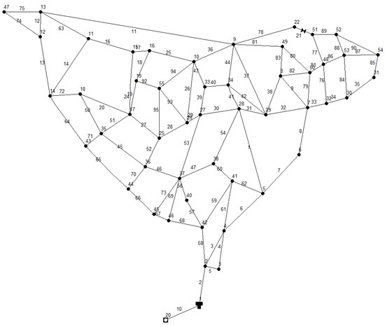 The methodology has been used on a real case related to the water distribution network of Spezzano Albanese (CS, Italy), a little town in the northern zone of Calabria. The network, involving 88 pipes, 49 nodes, and 1 tank, is shown in Figure 3. The total base demand circulating Qm in the network in steady-state conditions is 29.00 L/s for about 8500 users, according to the real data acquired. The value of Hmin varies from 300 to 353 m and Hs varies from about 315 to 368 m. In the analysis, the value of p/γmin = 20 m has been assumed for each node. These input data are related to winter conditions because during the summer Q can vary significantly with the seasonal fluctuant.