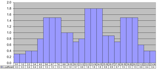 The chosen values of k*i coefficient adopted in the analysis are shown in Table 1 and they are those of a typical pattern (Figure 4) proposed for a similar town: k*0.3 = 0.3 describes night condition, k*1.0 = 1.0 is characteristic of the average conditions and k*1.8 = 1.8 is the peak condition.