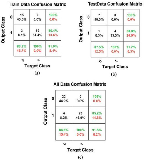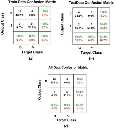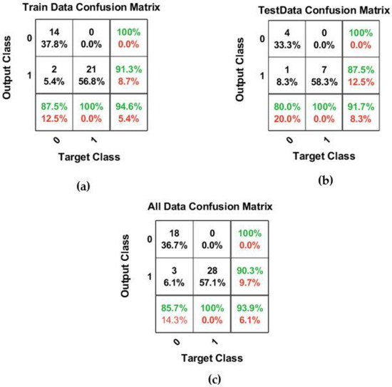 Figure 6. Results of the confusion matrix for training data (a), testing data (b), and total data (c) for k*0.3 = 0.3.
