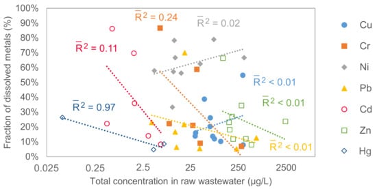 Fraction of dissolved heavy metals in raw municipal wastewater at different total heavy metal concentrations [34,35,39,40,41,42,43,44,46,47,48] ([40] includes data from two different WWTPs). (Data from [29,33] (included in Table 3) were not included, since average concentrations of total heavy metals in raw wastewater were not given/not easily read from paper.) (Data for As and Ag not available from multiple sites.) The dotted lines represent the linear regression between the percentage removal and the concentration of the different heavy metals in log form. The adjusted coefficient of determination () is given; this was calculated as follows:, where is the coefficient of determination, is the number of data points for the respective metal and is the number of explanatory variables, excluding the constant.