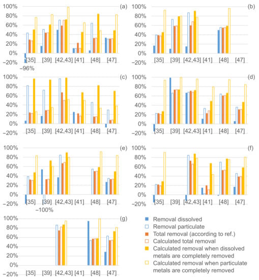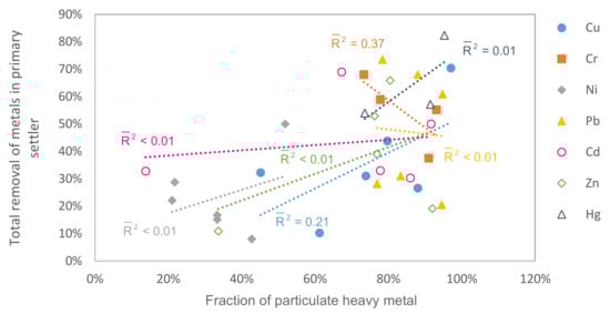 During primary settling, heavy metals are removed by removal of solids with which the heavy metals are associated. Sorption/desorption of heavy metals in the primary settler together with the speciation or partitioning of heavy metals in the influent wastewater determine the removal capacity [10,51]. Heavy metal removal was shown to correlate positively with SS removal [52]. SS removal was measured frequently in the published literature (measured by [35,41,47]; measured but not reported by [39]; not measured by [46]; in [5], total solids was measured in influent and primary sludge). Buzier et al. [39] found a positive correlation between particulate concentrations of Cu and Cr, and suspended solids concentrations, and proposed that “their removal is likely to be strongly linked to the suspended solids removal”. Based on Gardner et al. [47], the SS removal in 16 WWTPs in the UK was in the range ~45–63%; however, the correlation between heavy metal removal and SS removal in each individual plant was not reported.