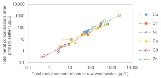 Further factors of importance for removal of heavy metals include wastewater pH and hydraulic retention time (HRT) of the primary settler [51]. Increased HRT was shown to increase heavy metal removal [52]. Information on pH and HRT is not always available in the published literature (with respect to heavy metal removal during primary settling), which makes it hard to generalize the findings fully (pH in influent and effluent from primary settling was reported by [5,41], but not by [35,39,46,47]; HRT was not reported by [5,35,39,41,46,47]).