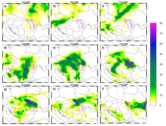 Daily precipitation totals (PP) for: (a) 19 July 2008; (b) 20 July 2008; (c) 21 July 2008; (d) 22 July 2008; (e) 23 July 2008; (f) 24 July 2008; (g) 25 July 2008; (h) 26 July 2008, and (i) 27 July 2008. Units: PP (mm/day).